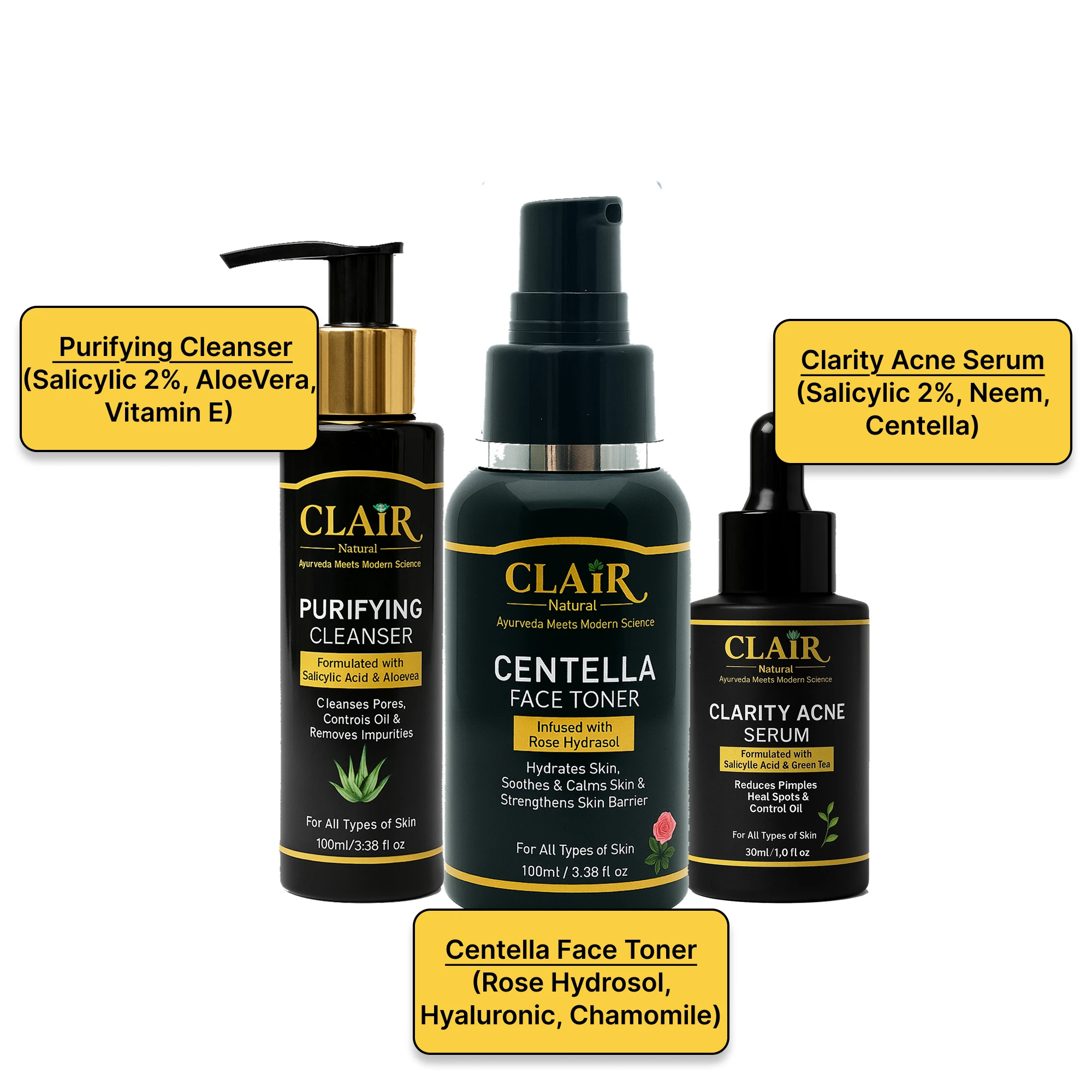 Combining BHA exfoliation, botanical anti-bacterial protection, and hydration + barrier repair creates a balanced routine that treats acne without stripping the skin.