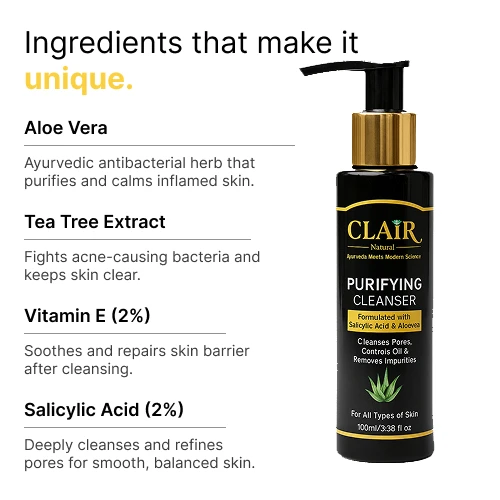1️⃣ Purifying Cleanser — 2% Salicylic Acid + Aloe Vera + Vitamin E