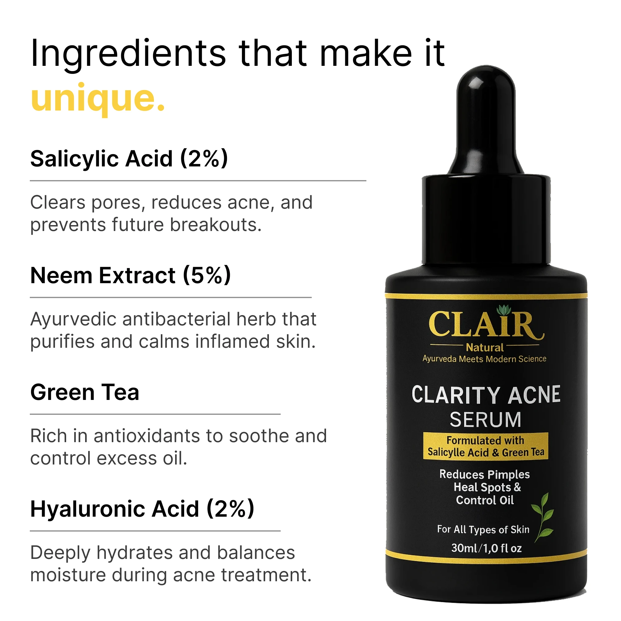 A: Neem is a cornerstone of Ayurvedic acne treatment, but most products use insufficient amounts. At 5%, Clarity provides clinically meaningful antibacterial and anti-inflammatory benefits. This concentration delivers the purifying power Neem is famous for while remaining non-irritating when combined with our soothing complex.