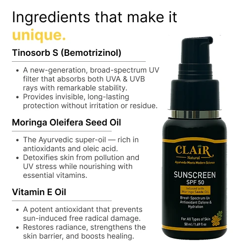 3️⃣ Sunscreen SPF 50 — Tinosorb S/M + Zinc + Moringa Oil