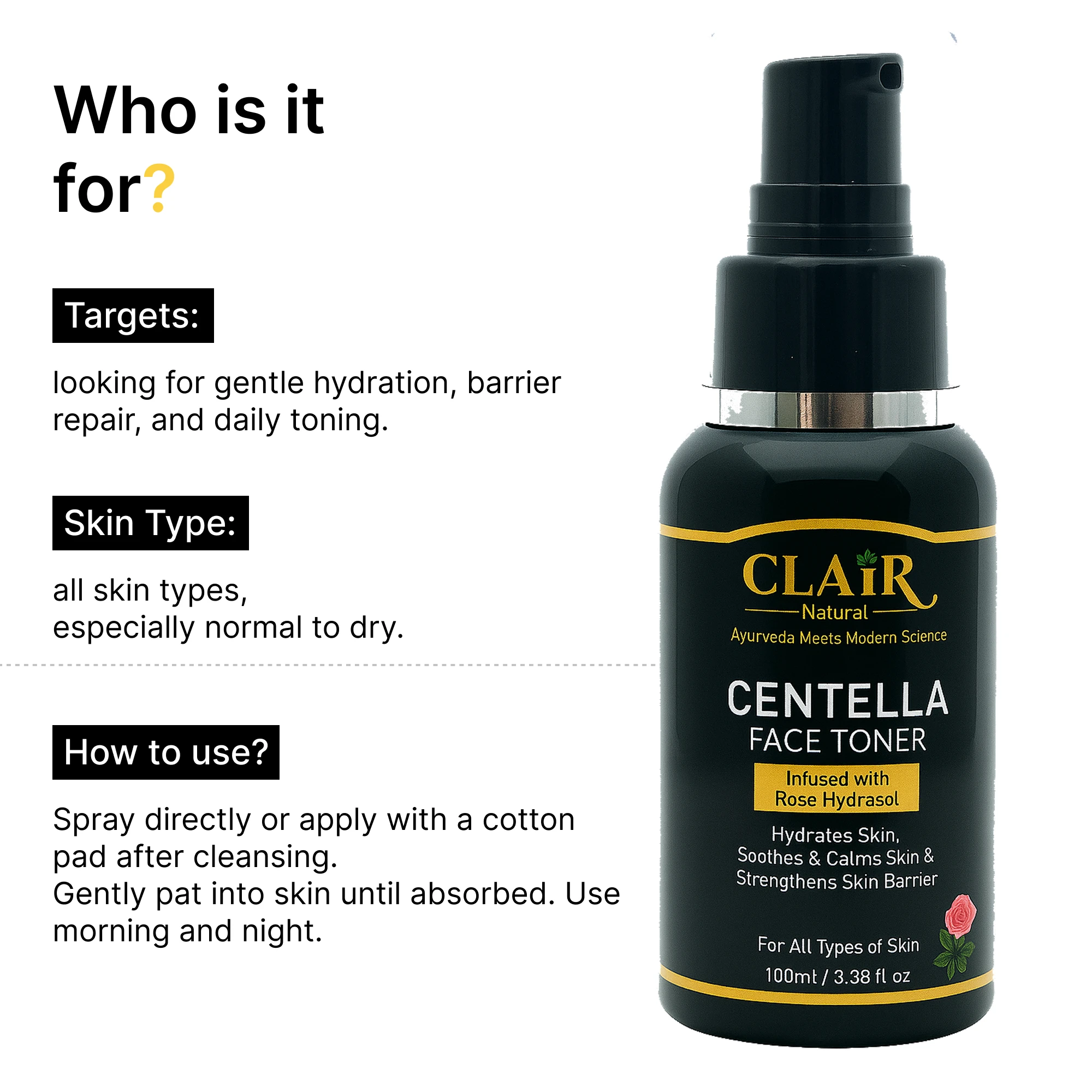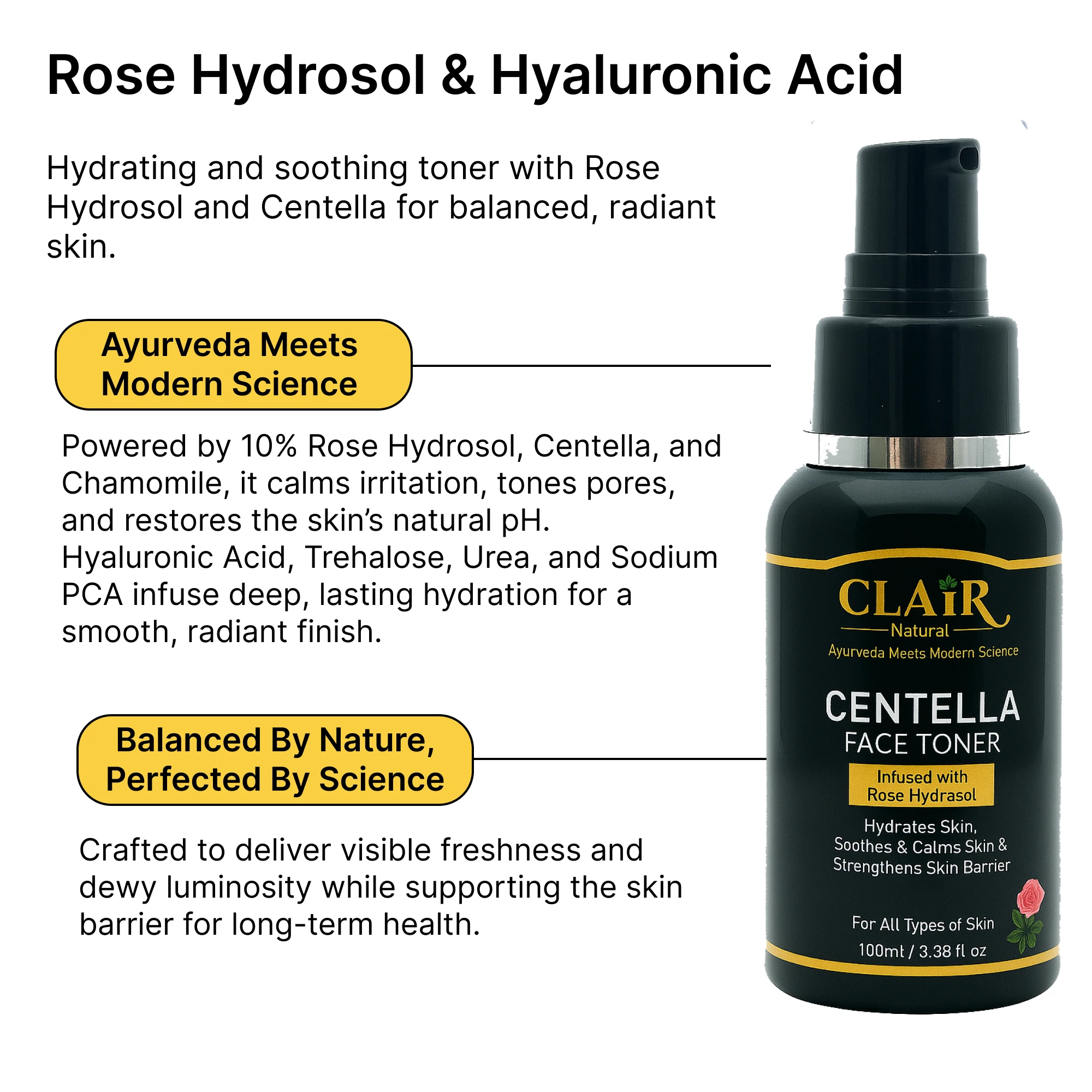 The Science of Calm: Clair Centella Face Toner Every ingredient serves a purpose—soothing, hydrating, healing, or protecting. This is intelligent toner formulation. Soothing & Anti-Inflammatory Layer: Rose Hydrosol 10%